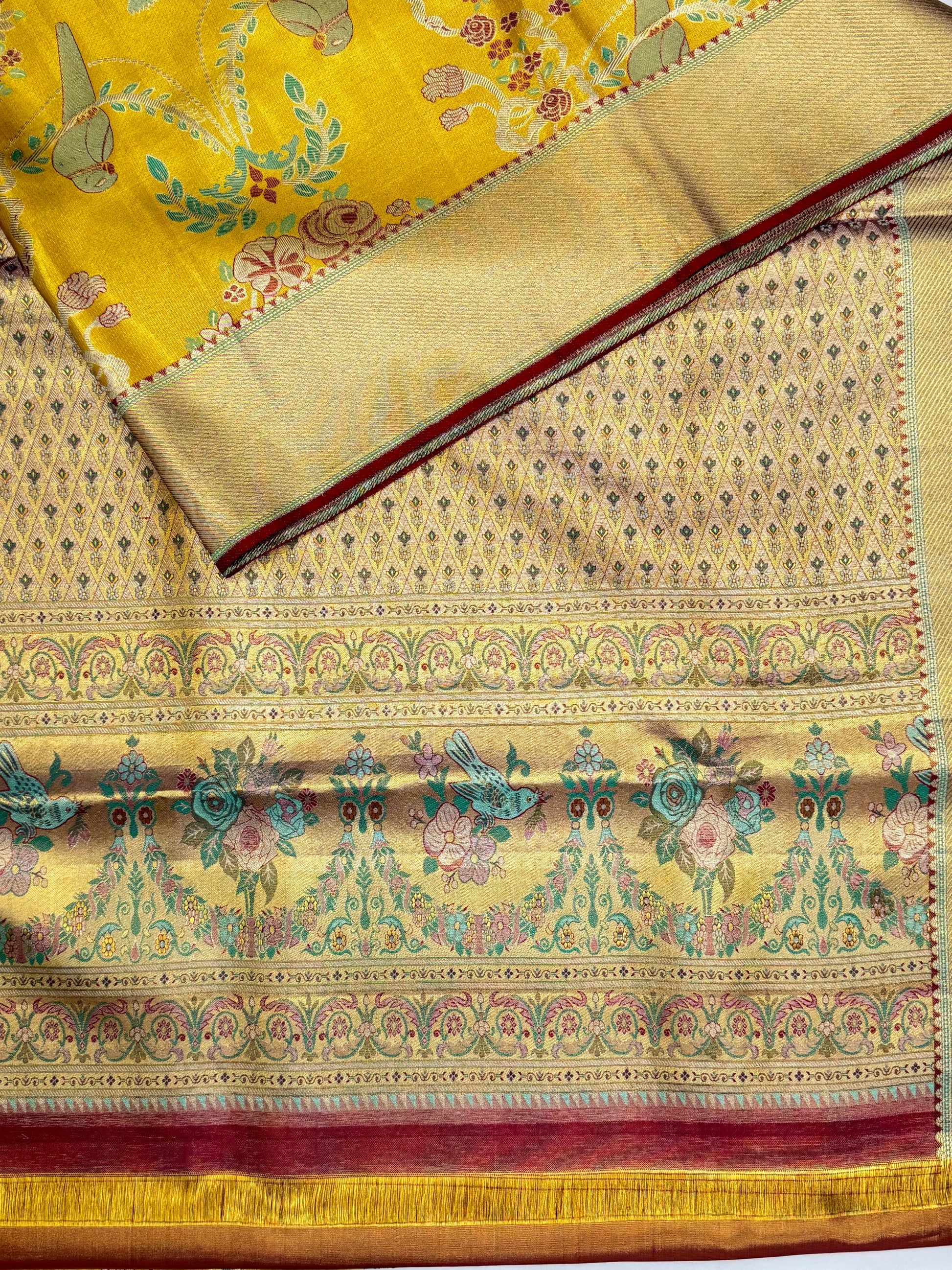 Mustard Yellow Handloom Meenakari Saree – Parrot & Royal Darbar Theme