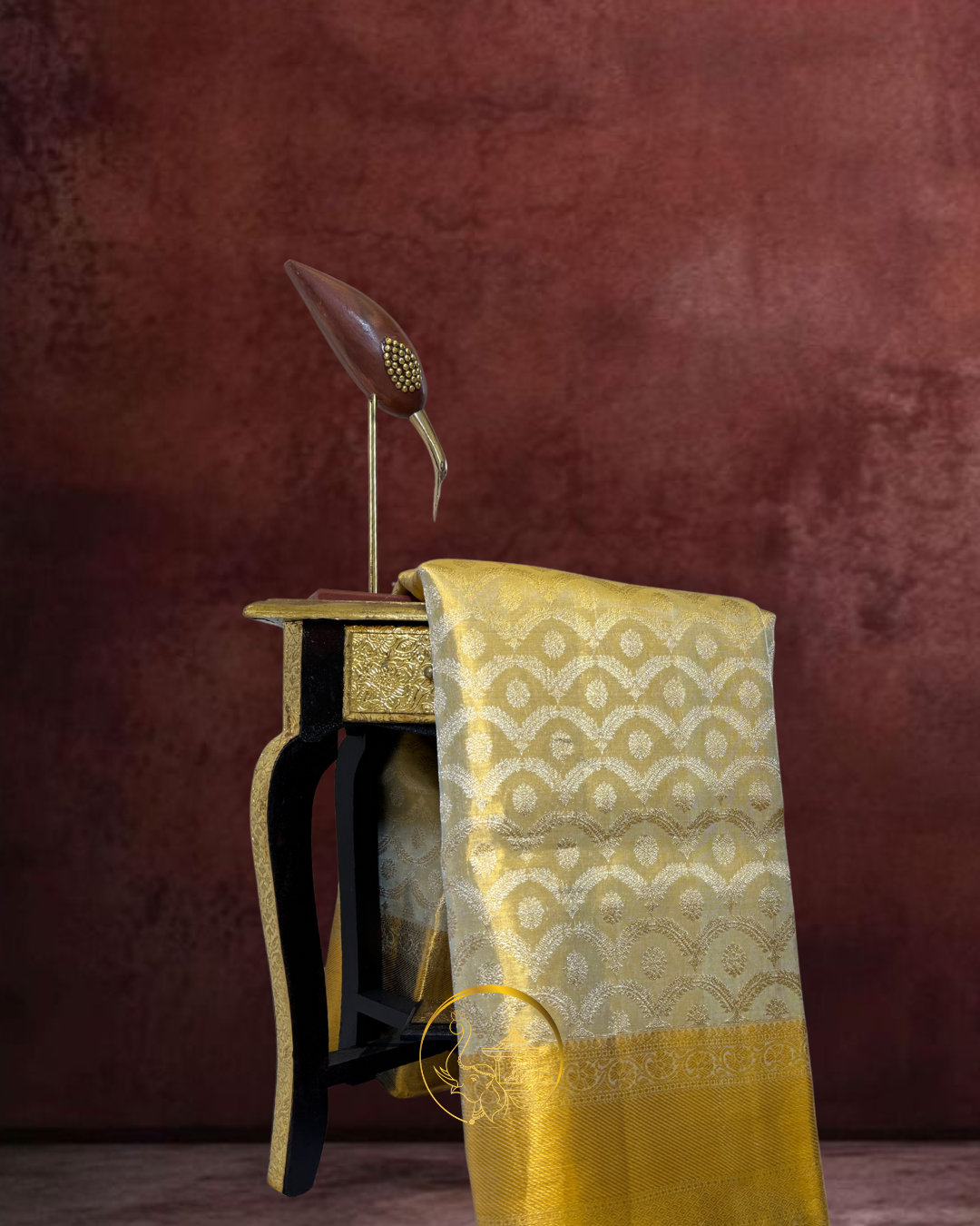 This ethereal Handloom Banarasi inspired silk Saree is a vision of understated opulence, where soft gold tissue shimmers with an elegant silvery sheen. The body is adorned with intricate jaal weaving, forming delicate floral buttas set in graceful arches, symbolizing prosperity and timeless charm. Its golden zari border, finished with refined floral and vine patterns, adds a touch of regal depth while keeping the drape fluid.